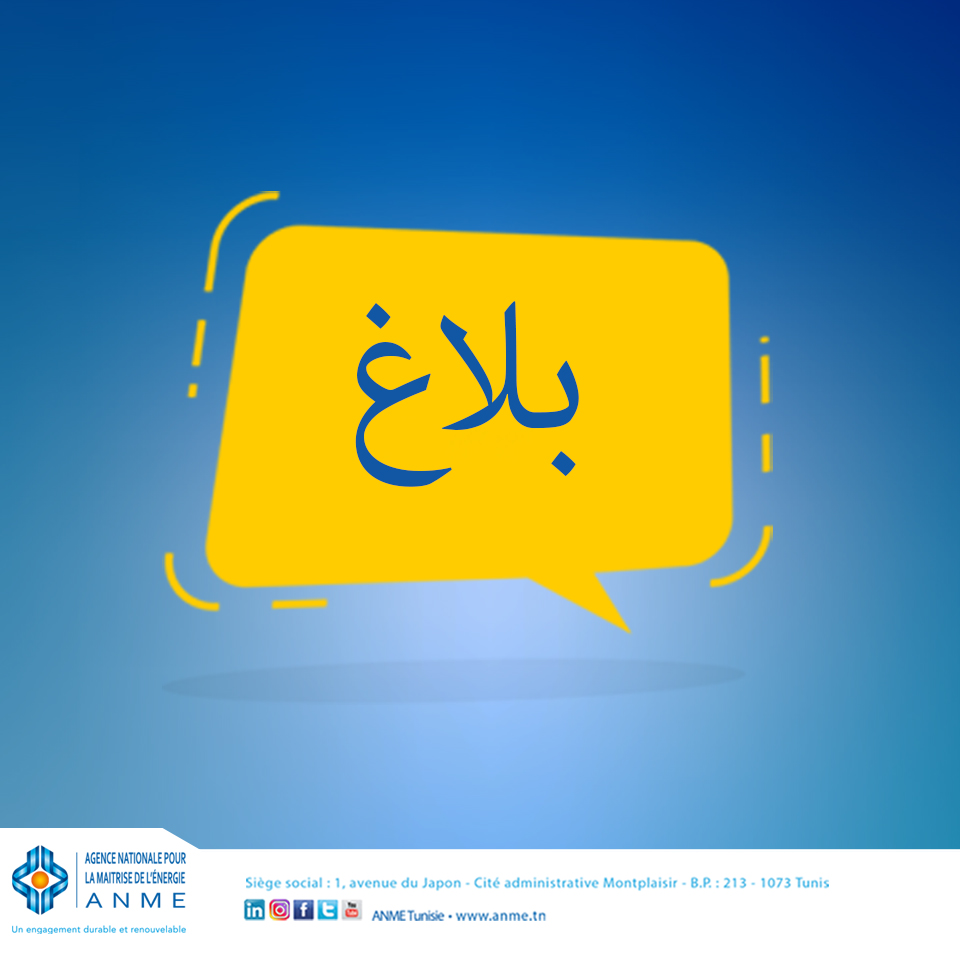 تدعو الوكالة الوطنية للتحكم في الطاقة كافة الشركات المؤهلة والناشطة في إطار برنامج تركيز تجهيزات إنتاج الكهرباء من الطاقات المتجددة بغرض الاستهلاك الذاتي بالنسبة للمنشآت المرتبطة بشبكة الجهد المنخفض (PROSOL-ELEC) إلى مدها بتوقعات انجازاتها سنة 2022 في أجل اقصاه يوم الإثنين 29 نوفمبر 2021 على الساعة منتصف النهار إما عن طريق مكتب الضبط المركزي أو عبر البريد الالكتروني contact@prosolelec.tn وذلك طبقا للجذاذة بالرابط أسفله.