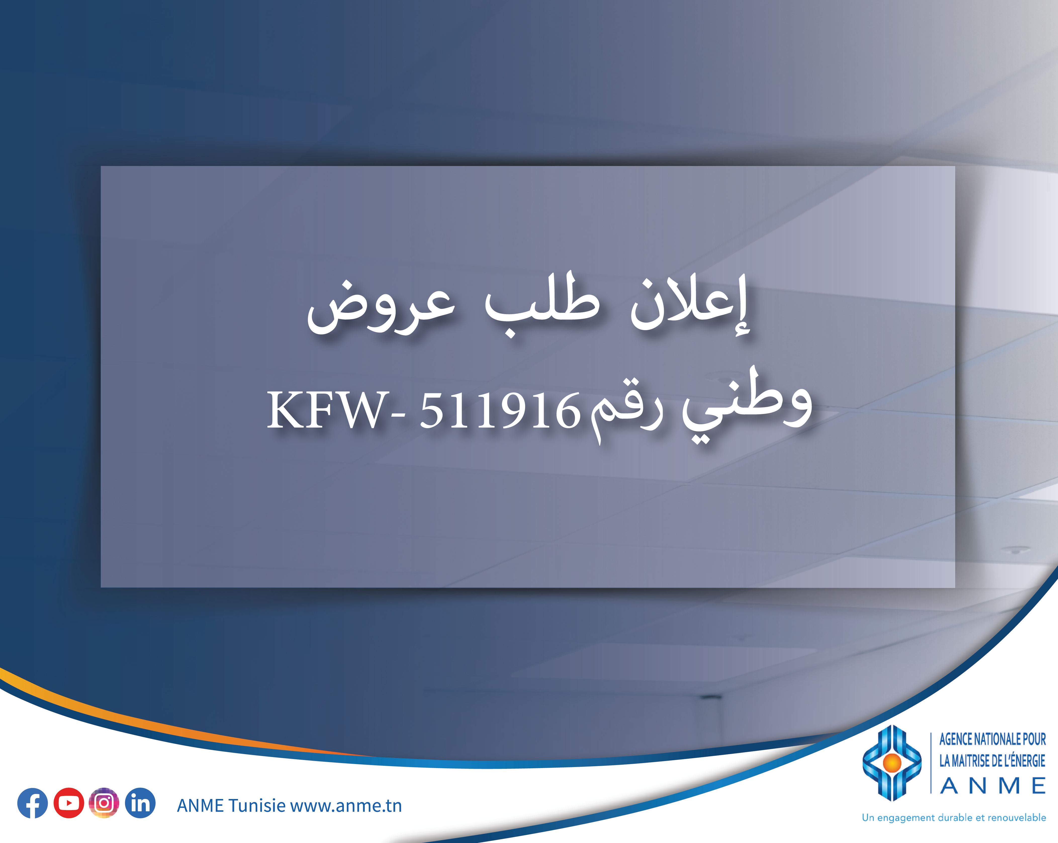 إعلان طلب عروض وطني رقم 511916-KFW : المراقبة الفنية لأشغال توريد وتركيب أنظمة إضاءة عالية الكفاءة لصالح 30 مؤسسة عمومية