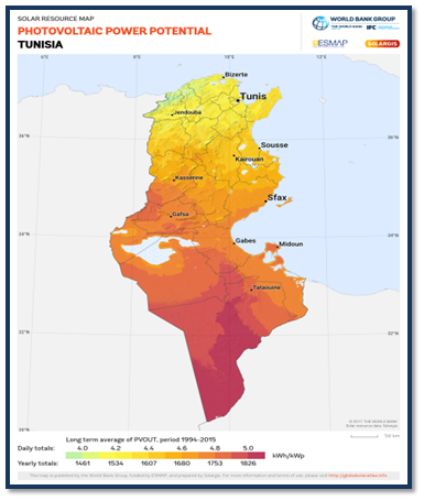 تتمتّع تونس بموارد شمسيةهامّة بمعدّل 3000 ساعة / سنة. وتختلف هذه الموارد من منطقة إلى أخرى، إذ تتميّز معظم مناطق الجنوب البلاد بمعدّلات أكبرتتراوح بين 3200 ساعة / سنة و3400 ساعة / سنة (على غرار منطقة الجنوب الشرقي). في حين يتراوح الحد الأدنى للفترة المشمسة في المناطق الشمالية بين 2500 و3000 ساعة / سنة. وتتراوح نسبة الإشعاع الشمسي من 1800 كيلوواط / ساعة / متر مربع / سنة في الشمال إلى 2600 كيلوواط / ساعة / متر مربع / سنة في الجنوب.