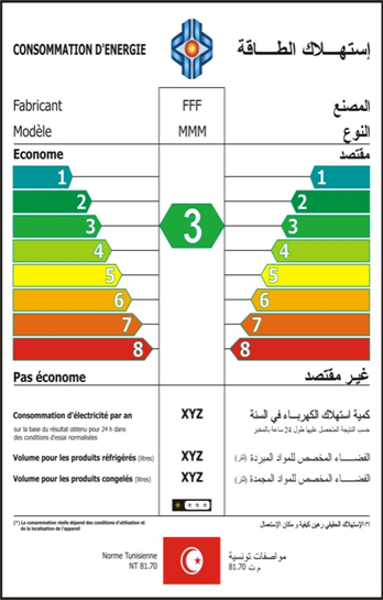 قامت تونس بتنفيذ برنامج للتصنيف الطاقي للأجهزة الكهرومنزلية يهدف إلى الالتزام بوضع ملصقات الطاقة على الأجهزة المعروضة في السوق من أجل إعلام الناس بالكفاءة الطاقية عند اقتناء الأجهزة.