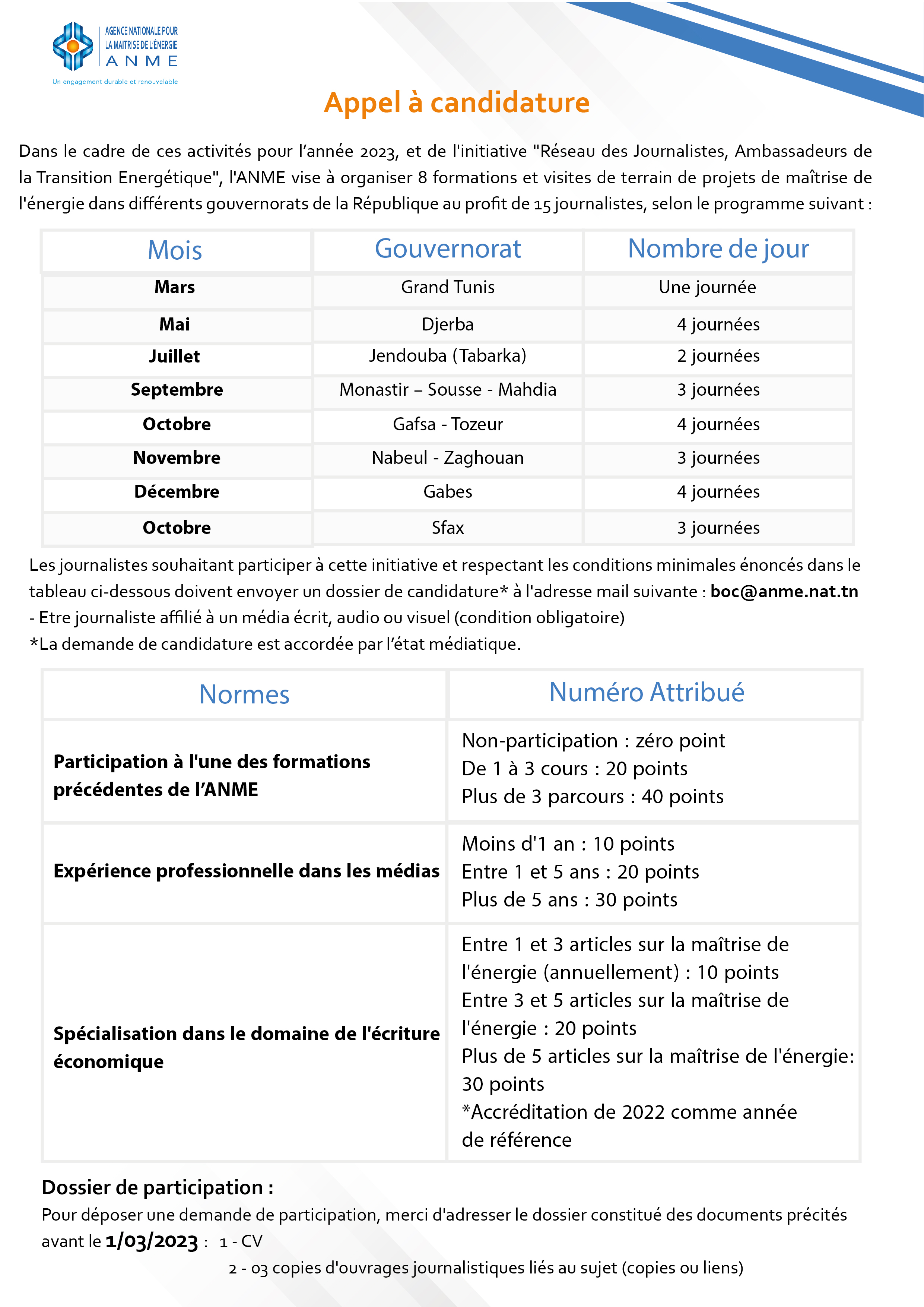 Dans le cadre de ces activités pour l’année 2023, et de l'initiative "Réseau des Journalistes, Ambassadeurs de la Transition Energétique", l'ANME vise à organiser 8 formations et visites de terrain de projets de maîtrise de l'énergie dans différents gouvernorats de la République au profit de 15 journalistes, selon le programme suivant :