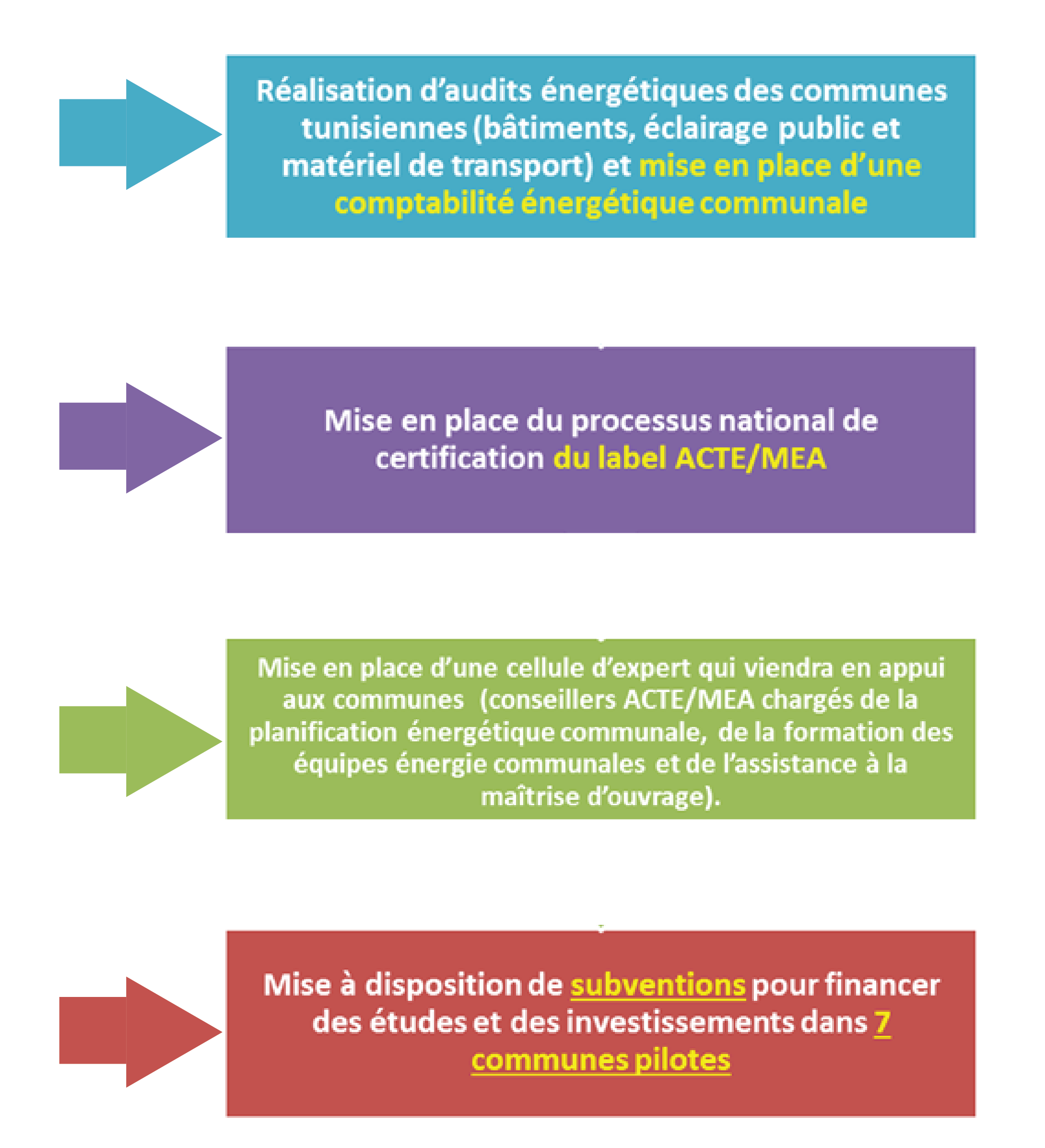 Par le choix de ces six domaines d’intervention, l’ANME a décidé de s’aligner au cadre méthodologique de l’European Energy Award (eea®) qui servira de base à la création, en Tunisie, d’un système de gestion et de certification énergétique communale et ce dans le cadre du « Projet d’appui au plan national de transition énergétique des communes en Tunisie, introduction du label ACTE/MEA » financé par le Secrétariat d'Etat à l'économie SECO (Coopération suisse).